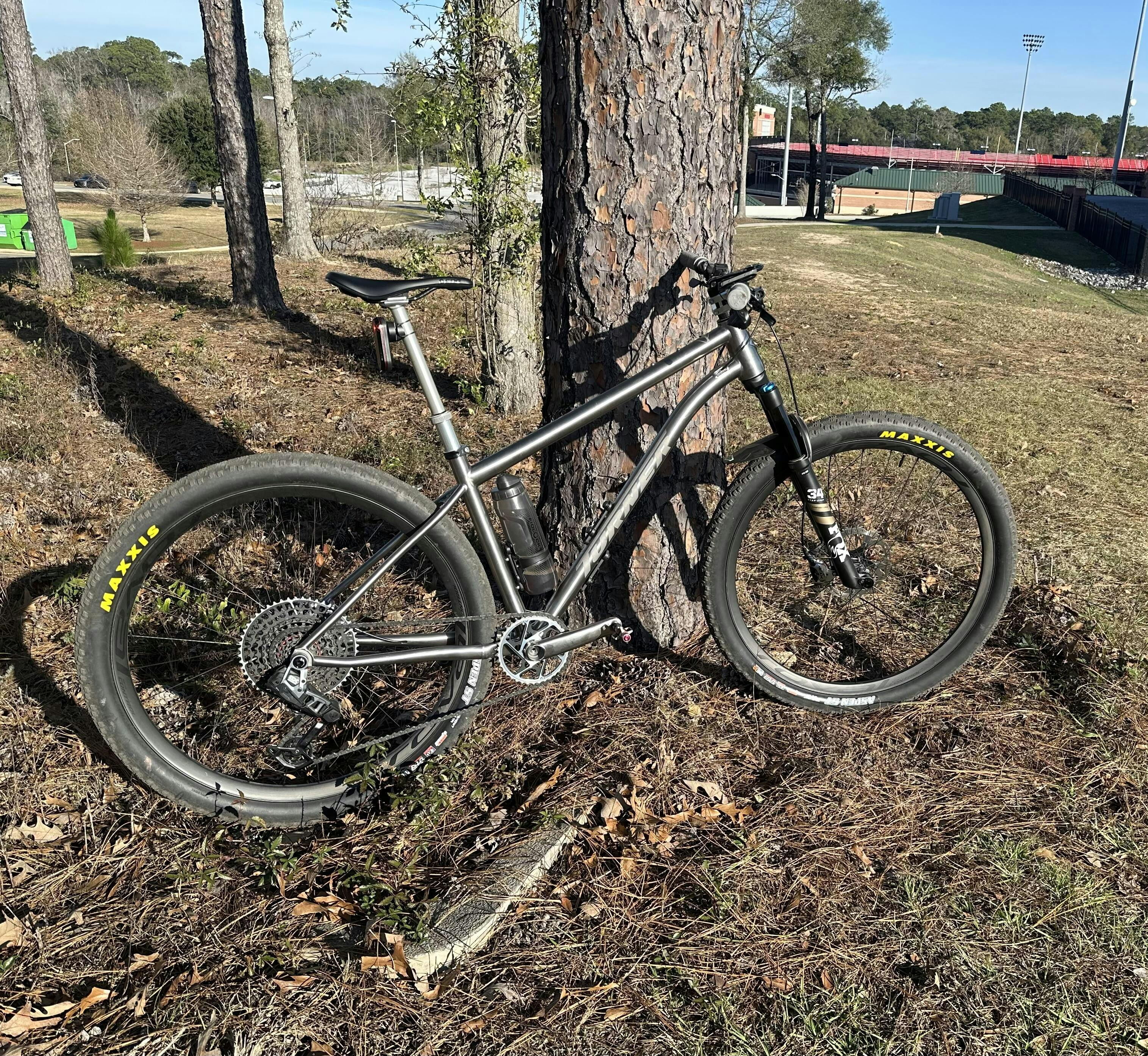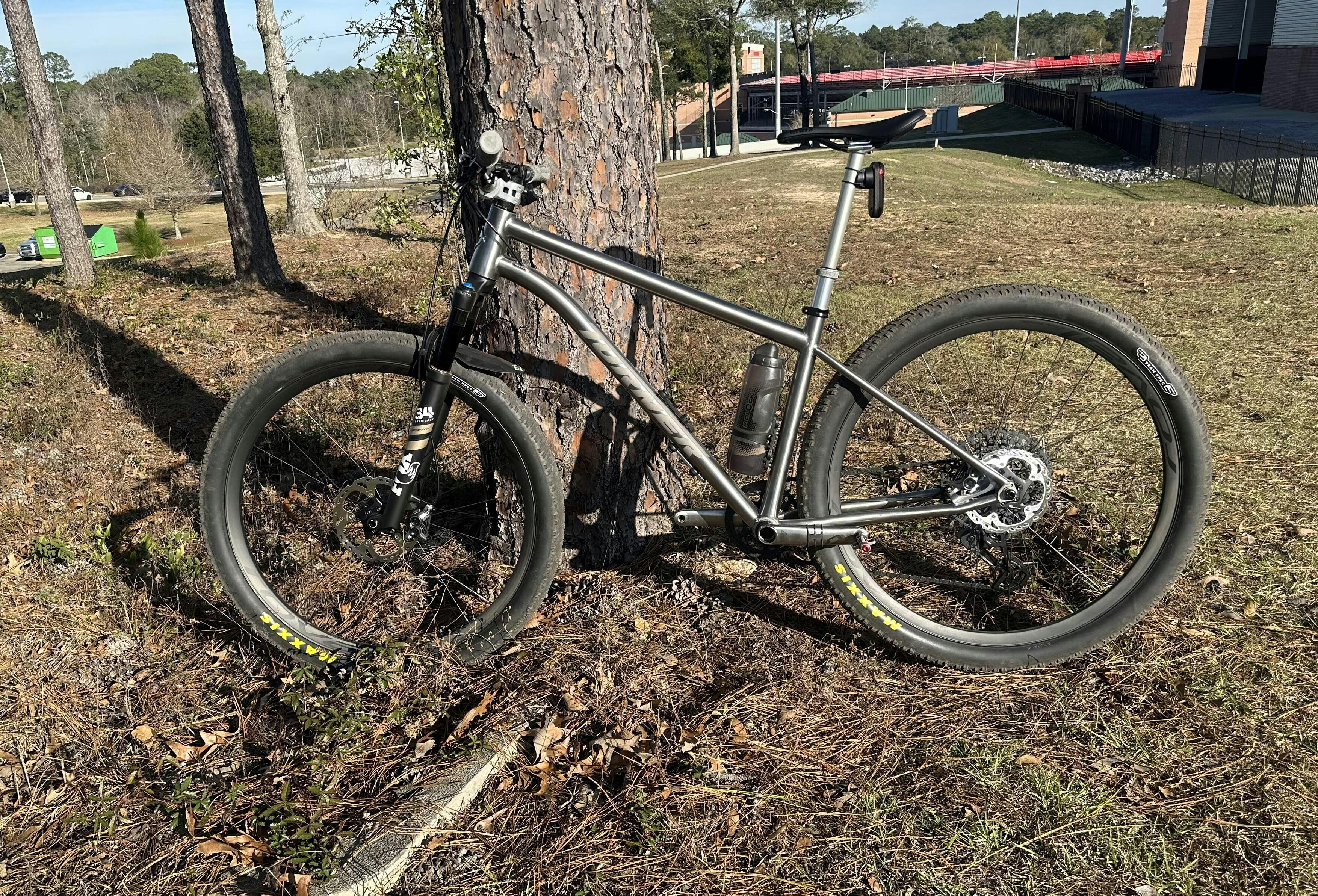 Built with mechanical xo1, Chris King bearings, and 1300 gram dt30 x light bicycle carbon hoops. Currently set up with v1 dissector and v1 forekaster for winter riding - a very comfortable setup. Total weight = 24lbs, but can easily drop a pound with weight weenie tires.